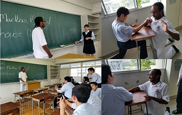 初日は、県立大網高校を訪問。集まった生徒の前で、オースティン君の大学の大先輩、キング牧師の有名なスピーチ”I have a dream”を披露してくれました。腕相撲や校内見学もして楽しい交流となりました。その後は、東金に移動し、八鶴湖や山王公園を散策しました。