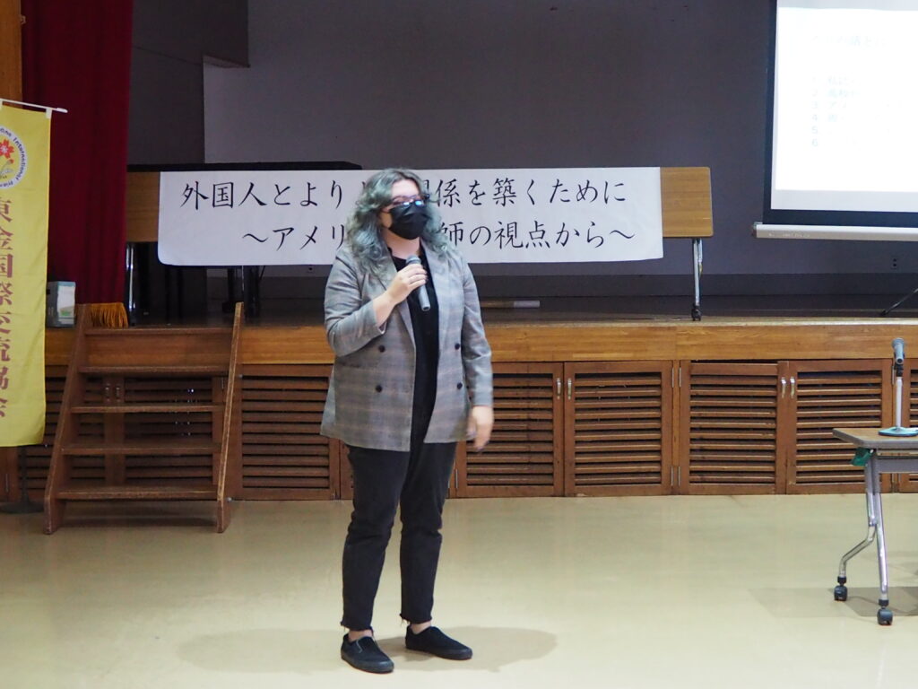 「外国人とよりよい関係を築くために」と題して、プロジェクターを使い流暢な日本語で話を進めてくれました。