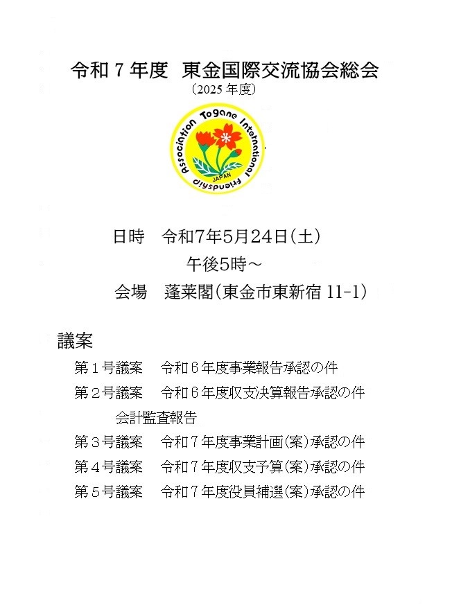 5月24日(土)蓬莱閣において令和7年度東金国際交流協会総会及び交流会を行いました。当日はお多用のところ、鹿間市長、坂本市議会議長はじめ多数のご来賓のご参加をいただきました。特に大網白里市国際交流協会の小林会長他2名の参加をいただきました。